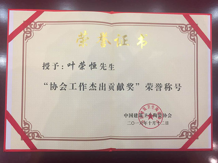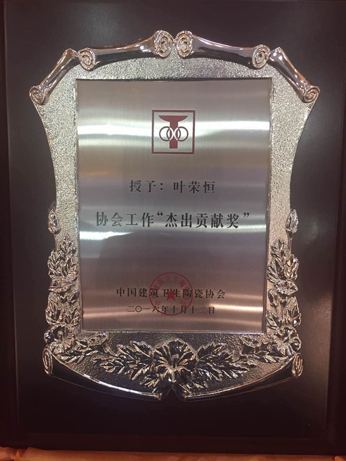 2016年10月12日,以“开拓创新,阔步奋世”为主题的中国建筑卫生陶瓷协会创立30周年庆典暨七届三次理事会议在淄博举行,作为陶卫行业权威行业协会之一,中国建筑卫生陶瓷协会全面回顾总结了协会和行业30年主要工作,为三十年来作杰出贡献的先进个人及企业进行表彰,广东香蕉视频黄版精工建材有限公司董事长兼总经理叶荣恒荣获“杰出贡献奖”。
